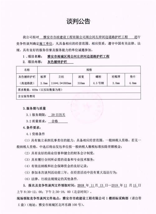 周公河左岸河邊道路護(hù)欄工程競爭性談判公告(市政公司)
