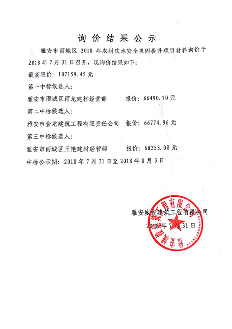 雅安市雨城區(qū)2018年農(nóng)村飲水安全鞏固提升項(xiàng)目材料詢價(jià)結(jié)果公示