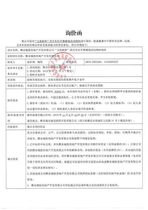雅安城投房地產(chǎn)開發(fā)有限公司“文曲新座”項目車位開售暖場活動物料詢價函(第二次)