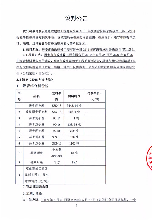 市政公司2019年度瀝青材料采購(gòu)項(xiàng)目競(jìng)爭(zhēng)性談判公告 (第二次)