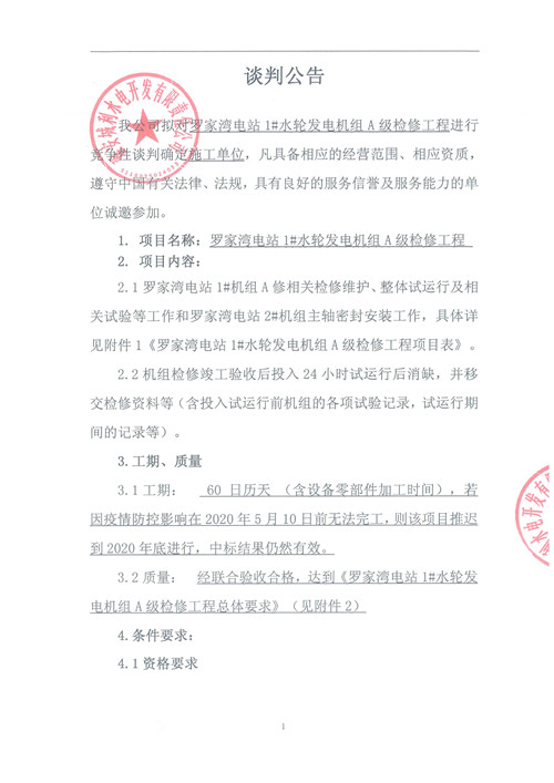 城利水電公司羅家灣電站1#水輪發(fā)電機組A級檢修工程競爭性談判公告