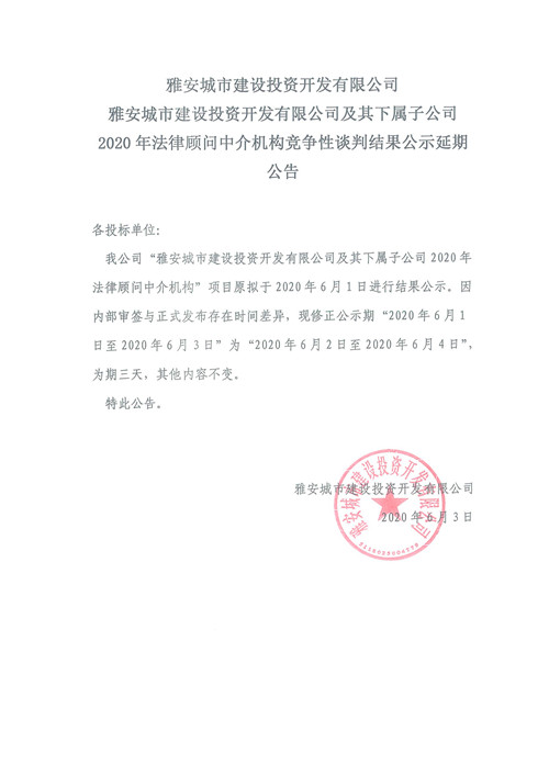 雅安城市建設投資開發(fā)有限公司及其下屬子公司2020年法律顧問中介機構競爭性談判結果公示延期公告
