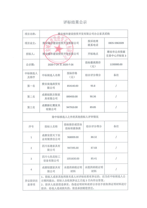 雅安城市建設(shè)投資開發(fā)有限公司辦公家具采購評標(biāo)結(jié)果公示