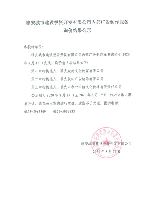 雅安城市建設(shè)投資開發(fā)有限公司公司內(nèi)部廣告制作服務詢價結(jié)果公示