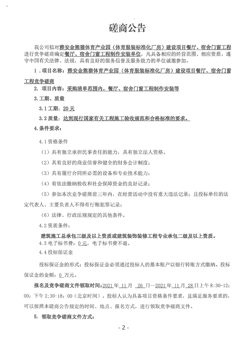 雅安金熊貓?bào)w育產(chǎn)業(yè)園(體育服裝標(biāo)準(zhǔn)化廠房)建設(shè)項(xiàng)目餐廳、宿舍門窗工程競(jìng)爭(zhēng)磋商公告