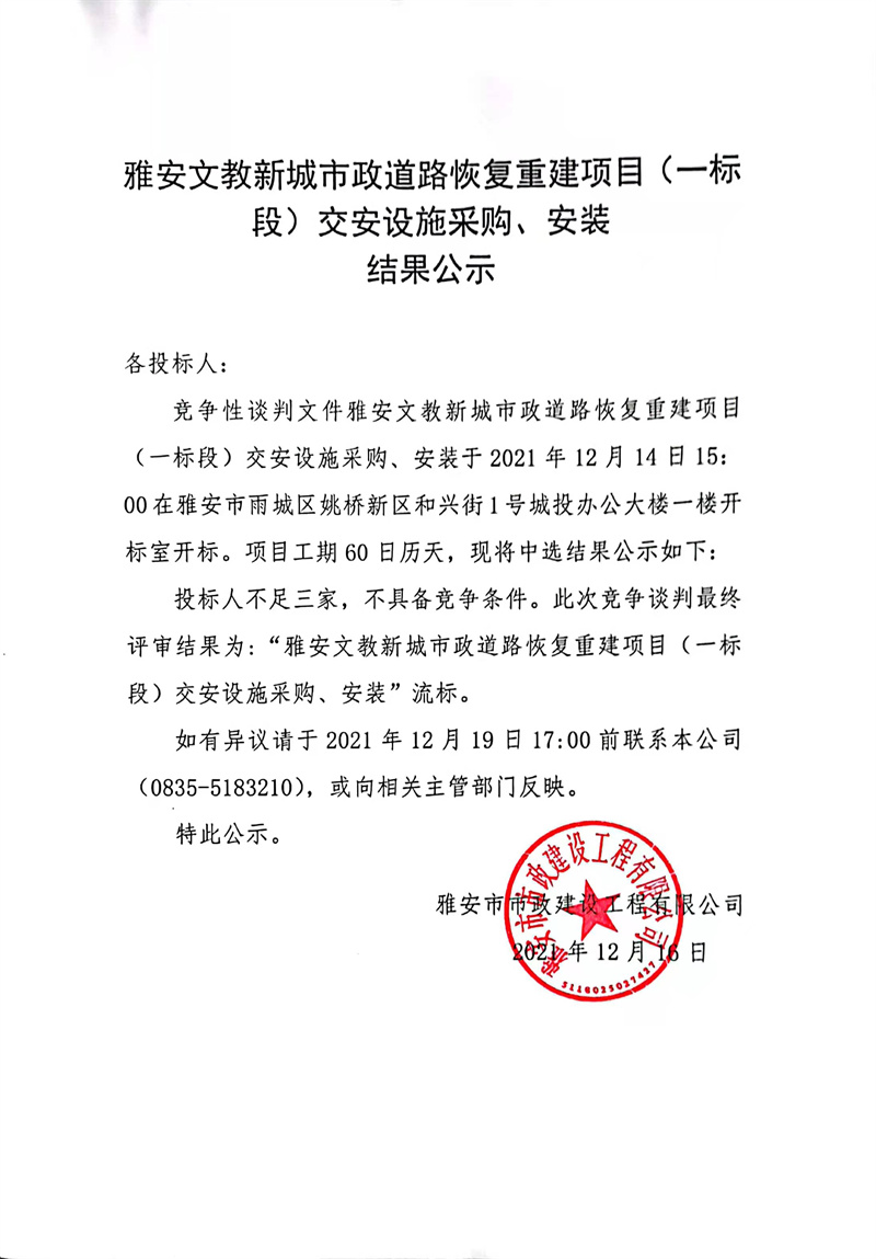 雅安文教新城市政道路恢復(fù)重建項(xiàng)目(一標(biāo)段)交安設(shè)施采購(gòu)、安裝結(jié)果公示