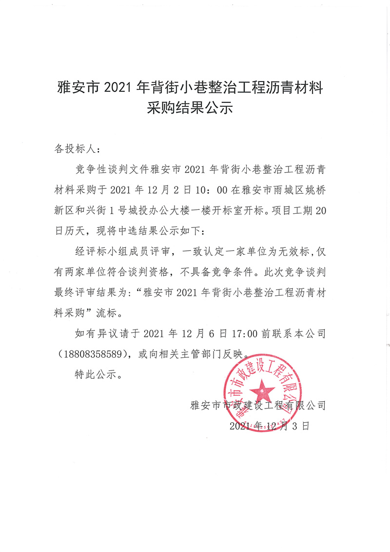 雅安市2021年背街小巷整治工程瀝青材料采購結(jié)果公示