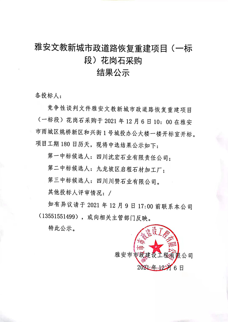 雅安文教新城市政道路恢復(fù)重建項目(一標段)花崗石采購結(jié)果公示