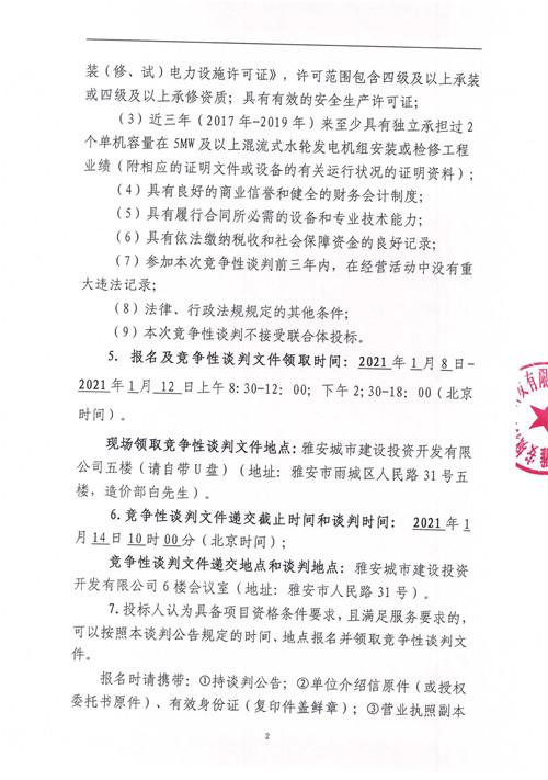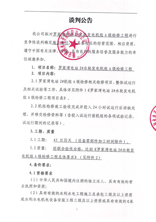 城利水電公司羅家灣電站2#水輪發(fā)電機(jī)組A級檢修工程競爭性談判公告