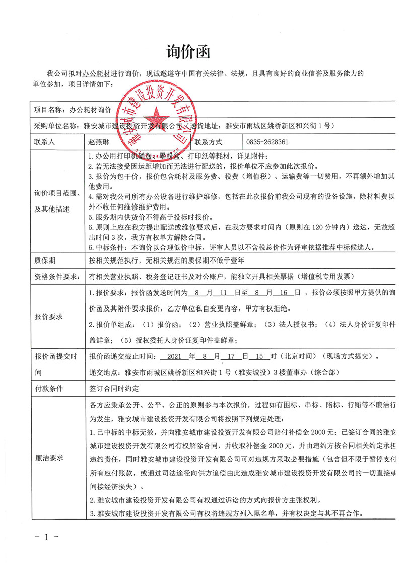 城投公司辦公耗材詢價(jià)函