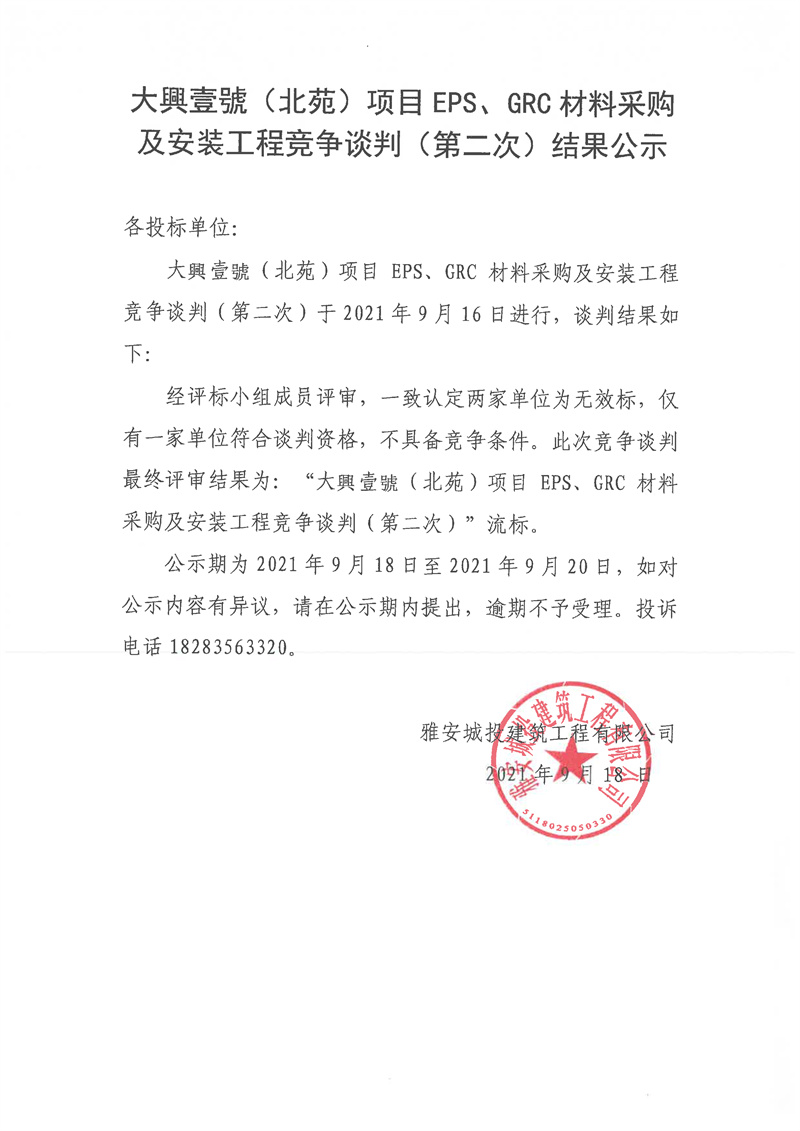 大興壹號(北苑)項目EPS、GRC材料采購及安裝工程競爭談判(第二次)結(jié)果公示