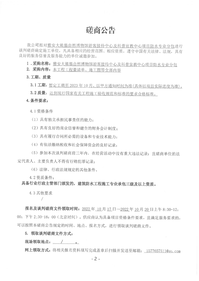 雅安大熊貓自然博物館游客接待中心及科普宣教中心項(xiàng)目防水專業(yè)分包談判磋商公告