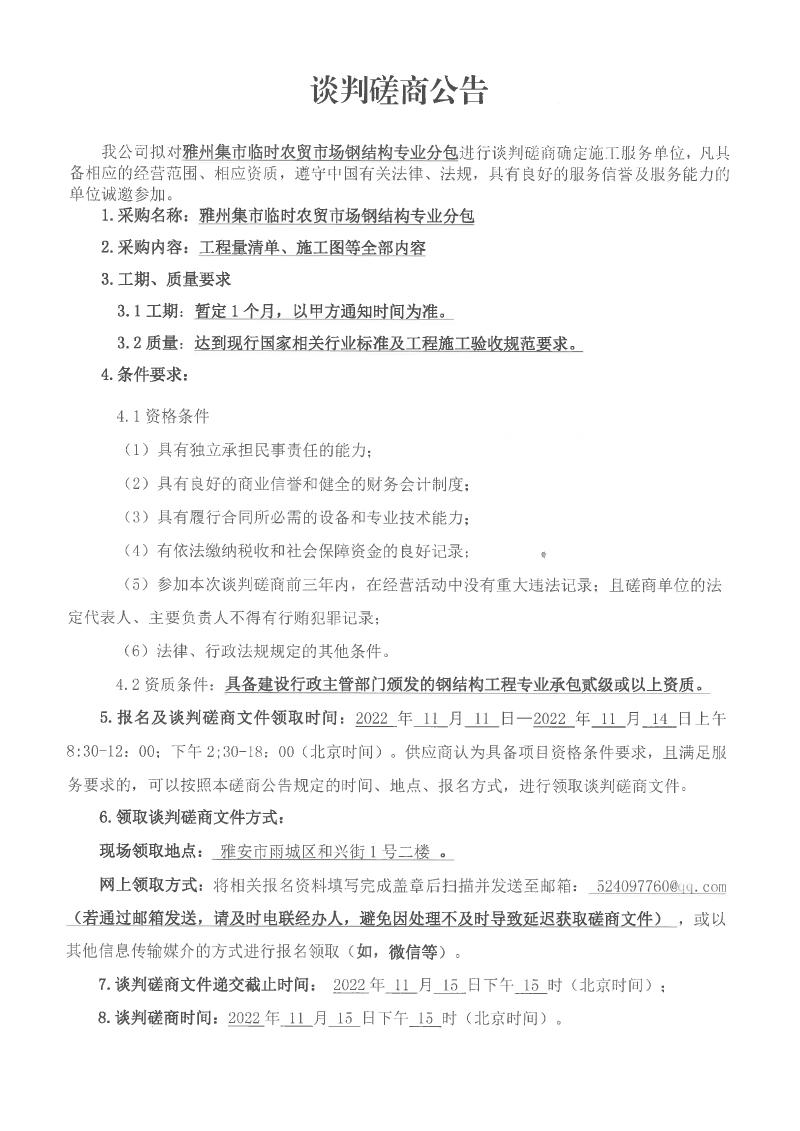 雅州集市臨時(shí)農(nóng)貿(mào)市場鋼結(jié)構(gòu)專業(yè)分包談判磋商公告