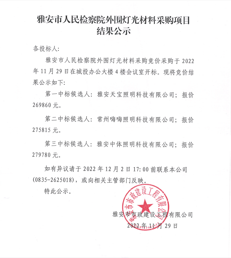 雅安市人民檢察院外圍燈光材料采購項目結果公示