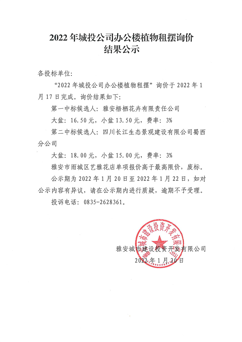 2022年城投公司辦公樓植物租擺詢價結(jié)果公示