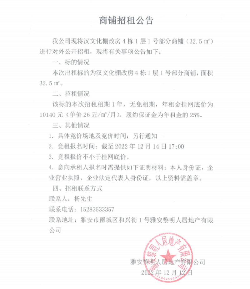 漢文化棚改房4棟1層1號部分商鋪招租公告