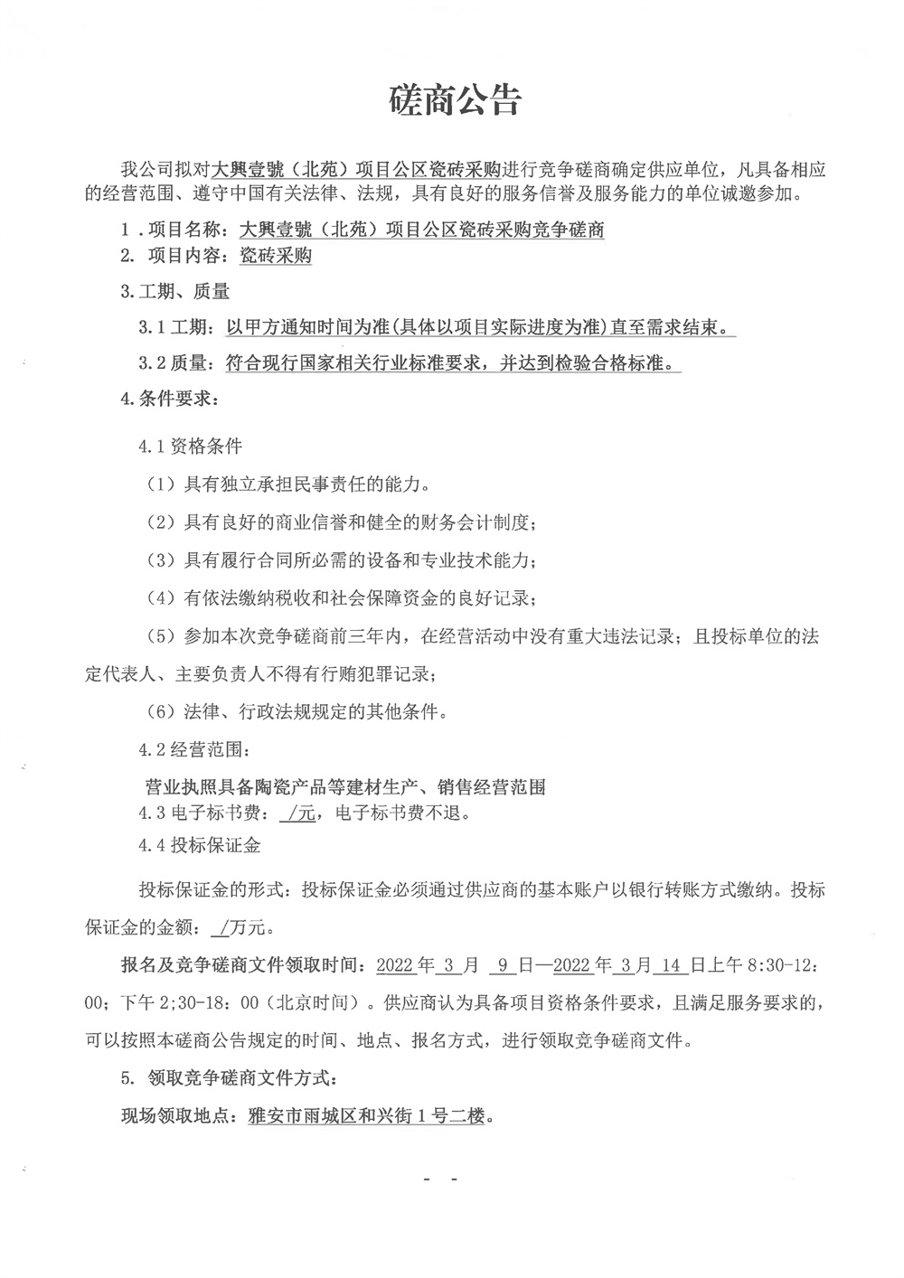 城投建工公司大興壹號(hào)(北苑)項(xiàng)目公區(qū)瓷磚采購(gòu)競(jìng)爭(zhēng)磋商公告