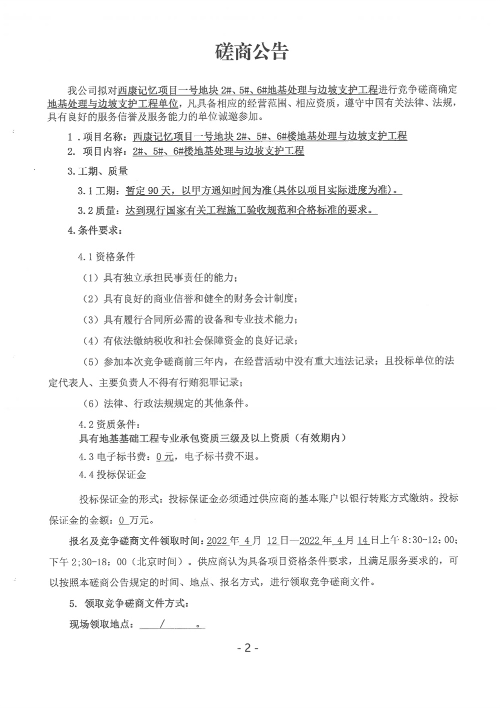 西康記憶項(xiàng)目一號地塊2#、5#、6#地基處理與邊坡支護(hù)工程磋商公告
