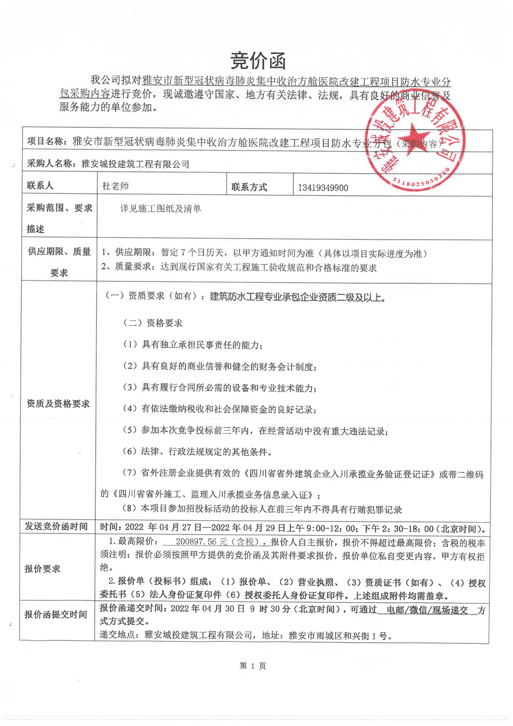 雅安市新型冠狀病毒肺炎集中收治方艙醫(yī)院改建工程項目防水專業(yè)分包采購