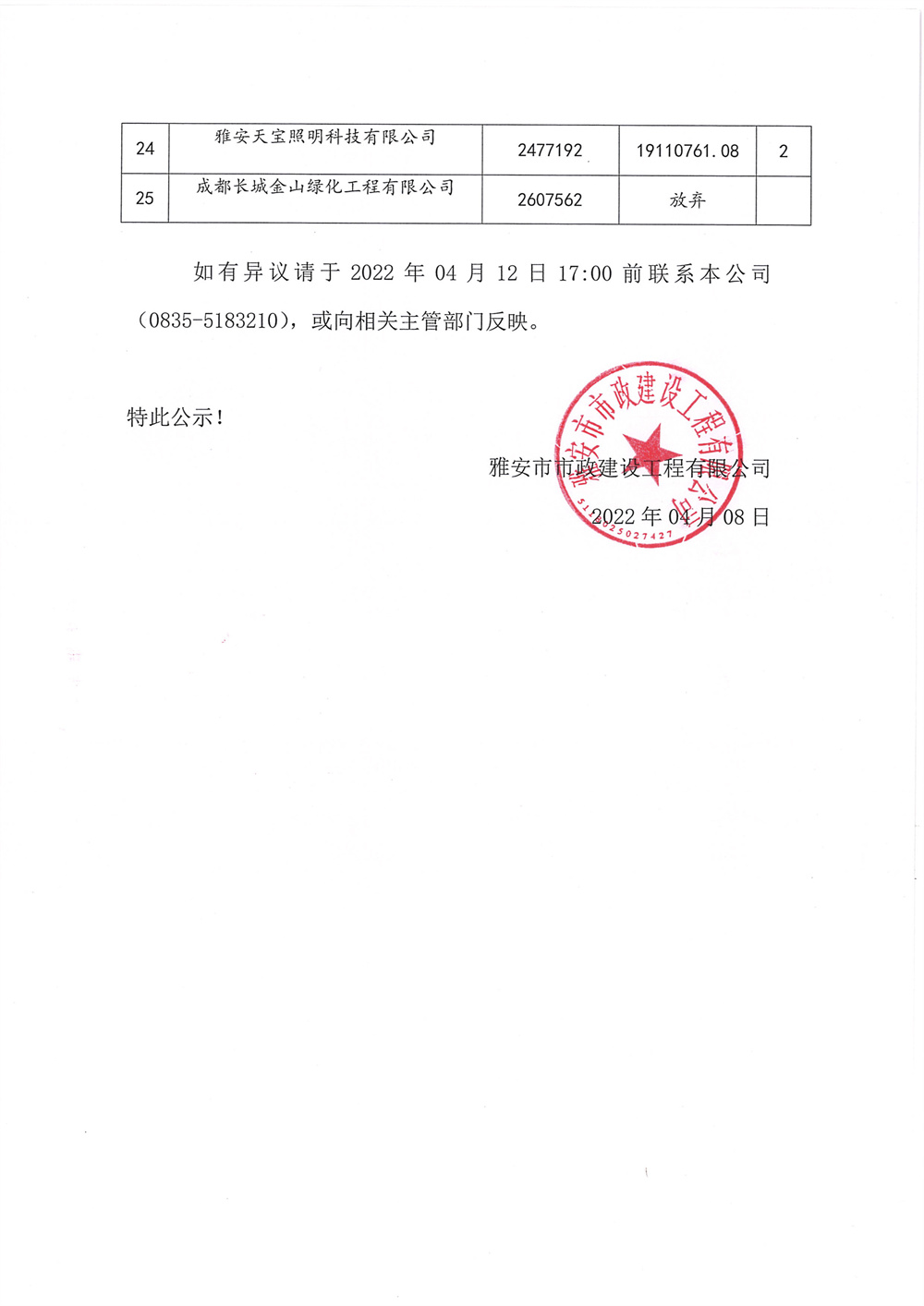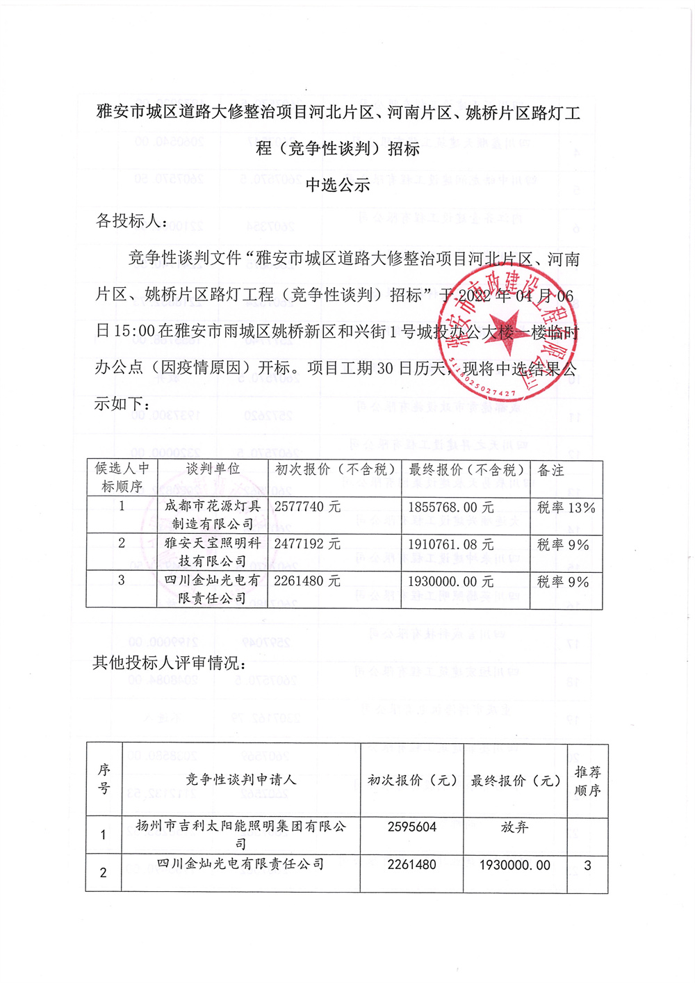 雅安市城區(qū)道路大修整治項目 河北片區(qū)、河南片區(qū)、姚橋片區(qū)路燈工程競爭性談判招標(biāo)中選公示