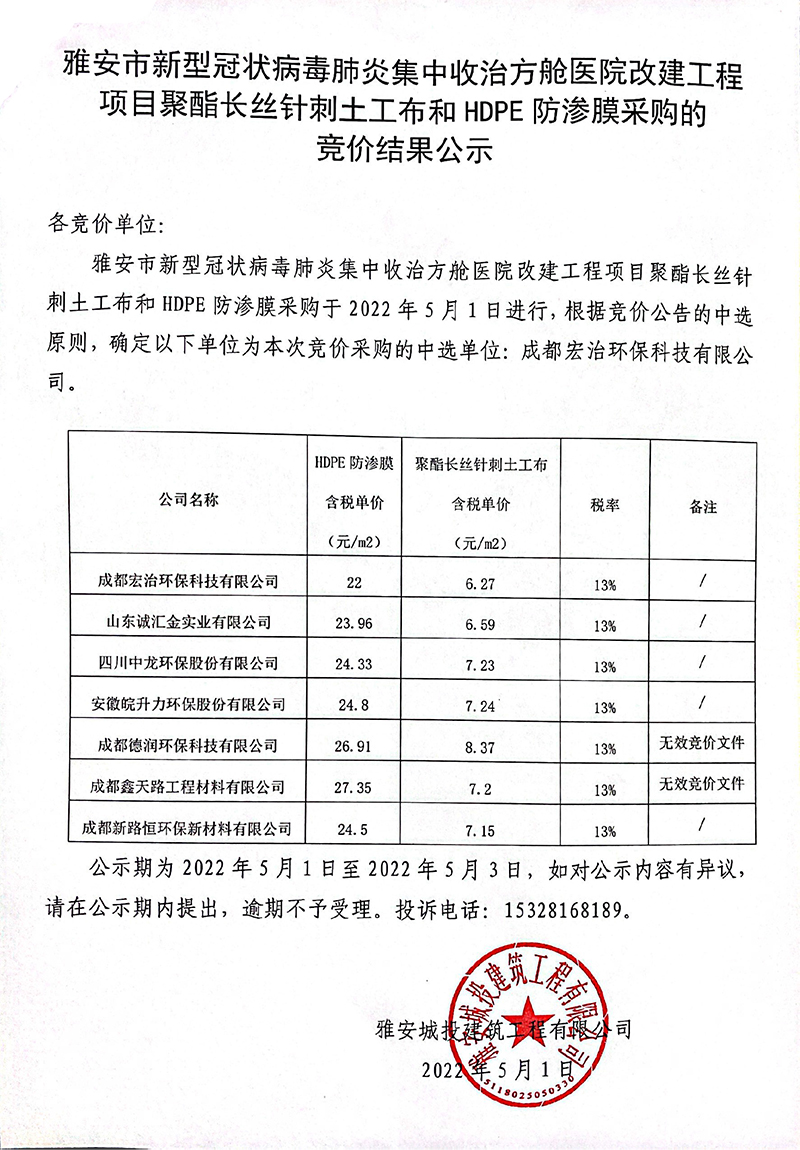 關(guān)于雅安市新型冠狀病毒肺炎集中收治方艙醫(yī)院改建工程項(xiàng)目聚酯長(zhǎng)絲針刺土工布和HDPE防滲膜采購(gòu)的競(jìng)價(jià)結(jié)果公示