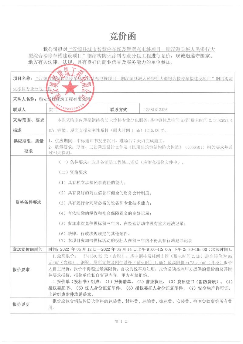 漢源縣城市智慧停車場(chǎng)及智慧充電樁項(xiàng)目一期漢源縣城人民銀行大型綜合樓停車樓建設(shè)項(xiàng)目防火涂料專業(yè)分包競(jìng)價(jià)采購公告