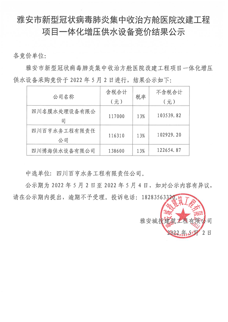 雅安市新型冠狀病毒肺炎集中收治方艙醫(yī)院改建工程項(xiàng)目一體化增壓供水設(shè)備競(jìng)價(jià)結(jié)果公示