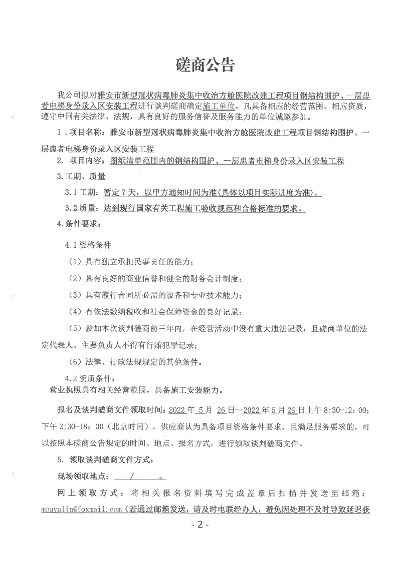 雅安市新型冠狀病毒肺炎集中收治方艙醫(yī)院改建工程項目鋼結(jié)構(gòu)圍護、一層患者電梯身份錄入?yún)^(qū)安裝工程采購