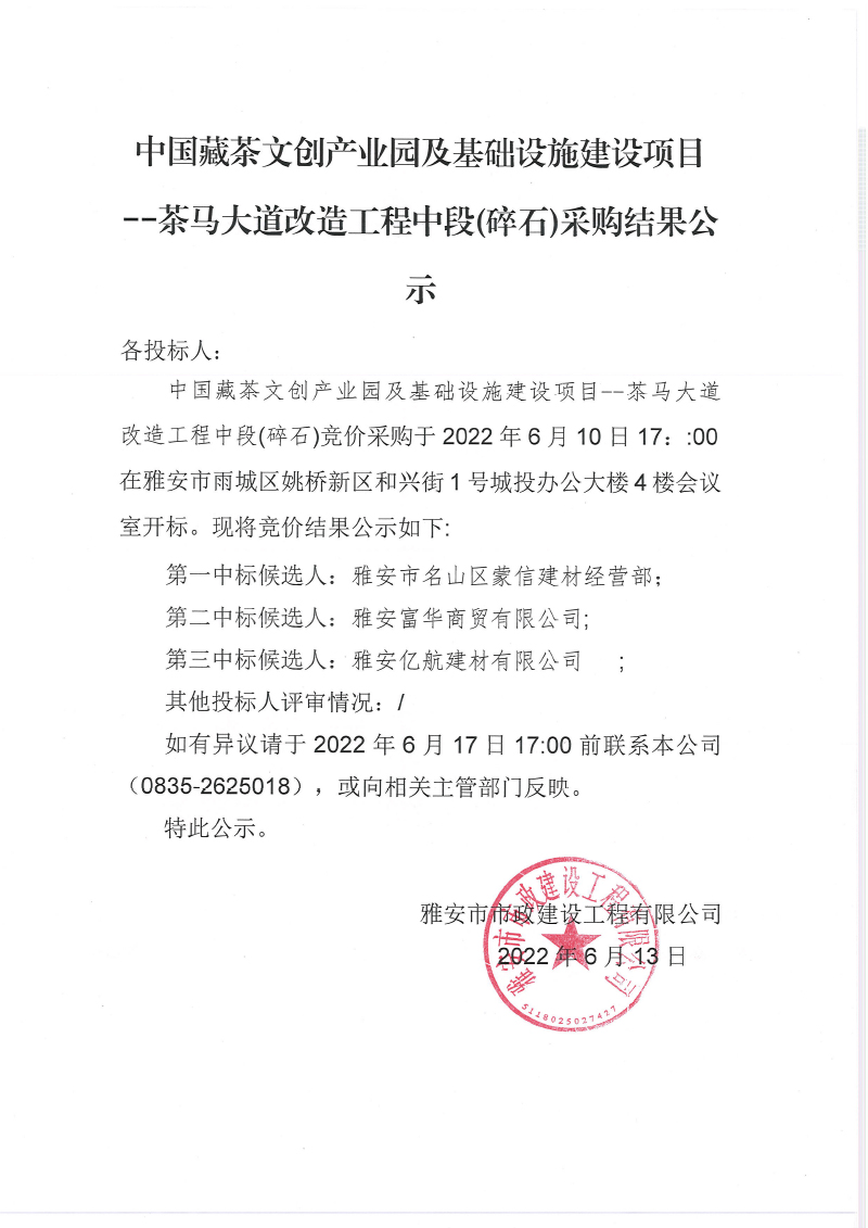 中國(guó)藏茶文創(chuàng)產(chǎn)業(yè)園及基礎(chǔ)設(shè)施建設(shè)項(xiàng) 茶馬大道改造工程中段碎石采購(gòu)結(jié)果公示