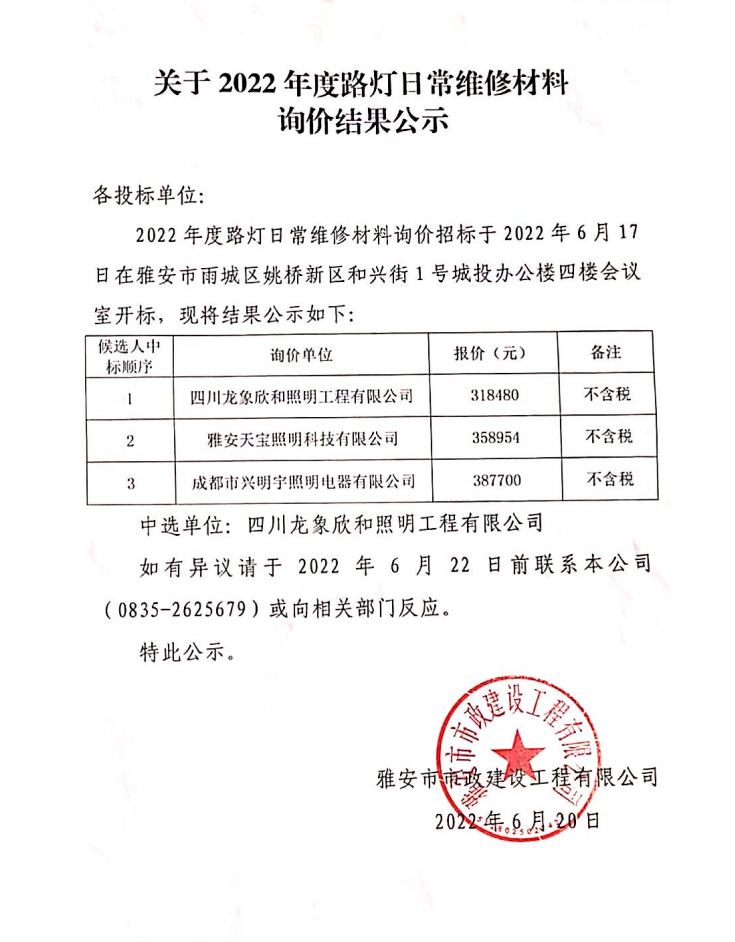 2022年路燈日常維修材料詢價(jià)結(jié)果公示