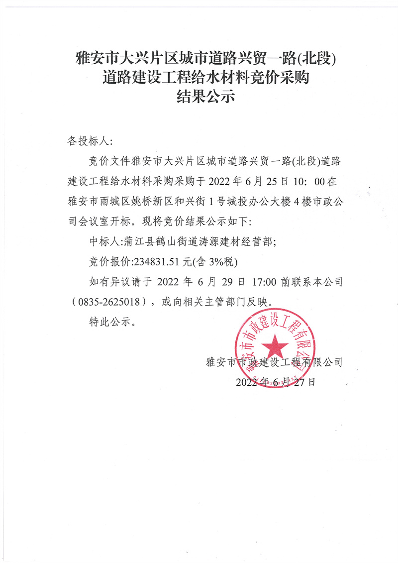 雅安市大興片區(qū)城市道路興貿一路(北段) 道路建設工程給水材料采購結果公告