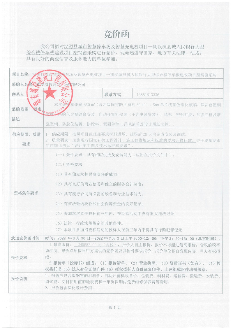 漢源縣城市智慧停車場及智慧充電樁項目一期漢源縣城人民銀行大型綜合樓停車樓建設(shè)項目塑鋼窗采購競價公告