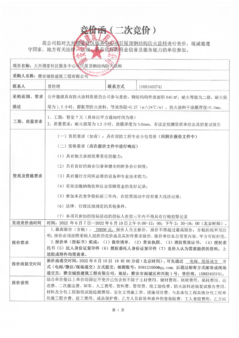 大興穆家社區(qū)服務(wù)中心項(xiàng)目屋頂鋼結(jié)構(gòu)防火涂料競(jìng)價(jià)公告