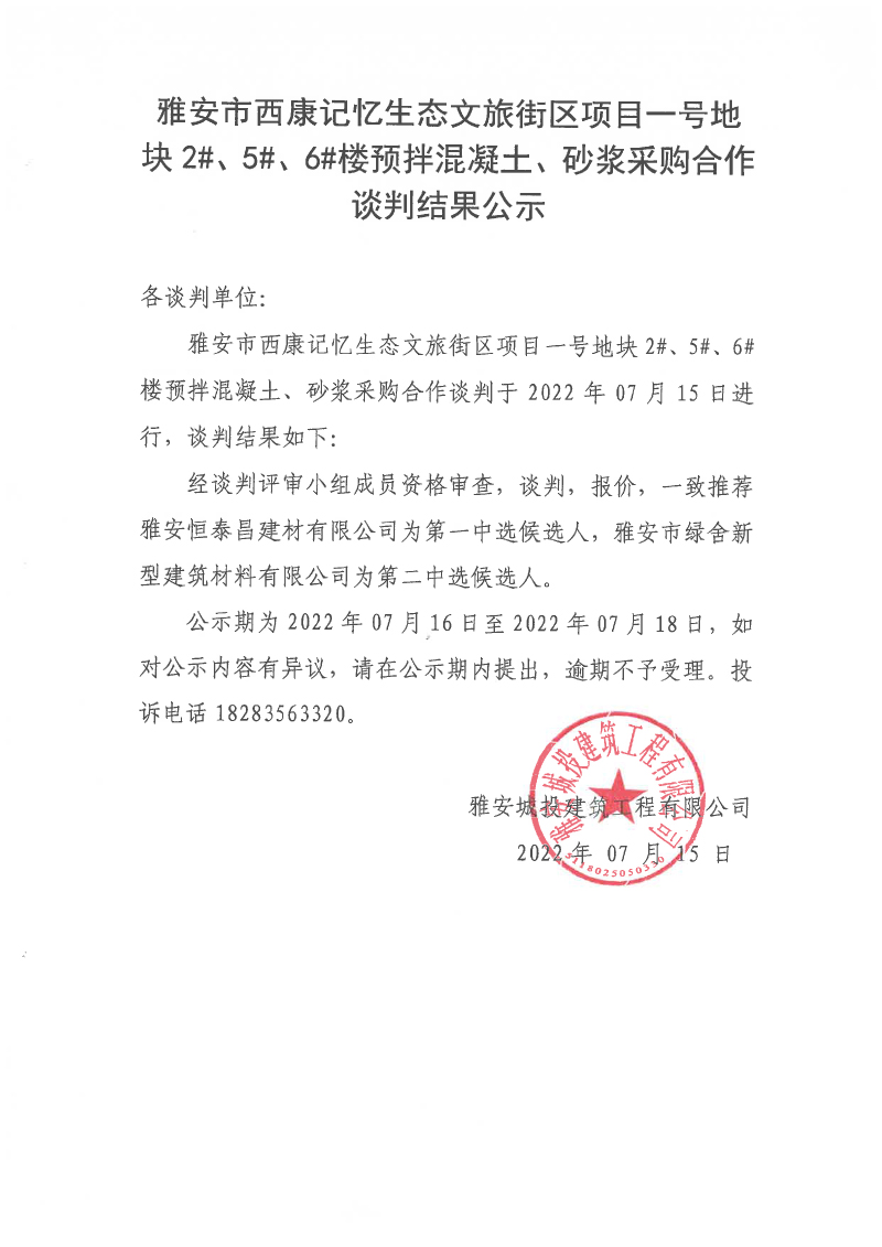 雅安市西康記憶生態(tài)文旅街區(qū)項(xiàng)目一號(hào)地塊2#、5#、6#樓預(yù)拌混凝土、砂漿采購(gòu)合作談判結(jié)果公示