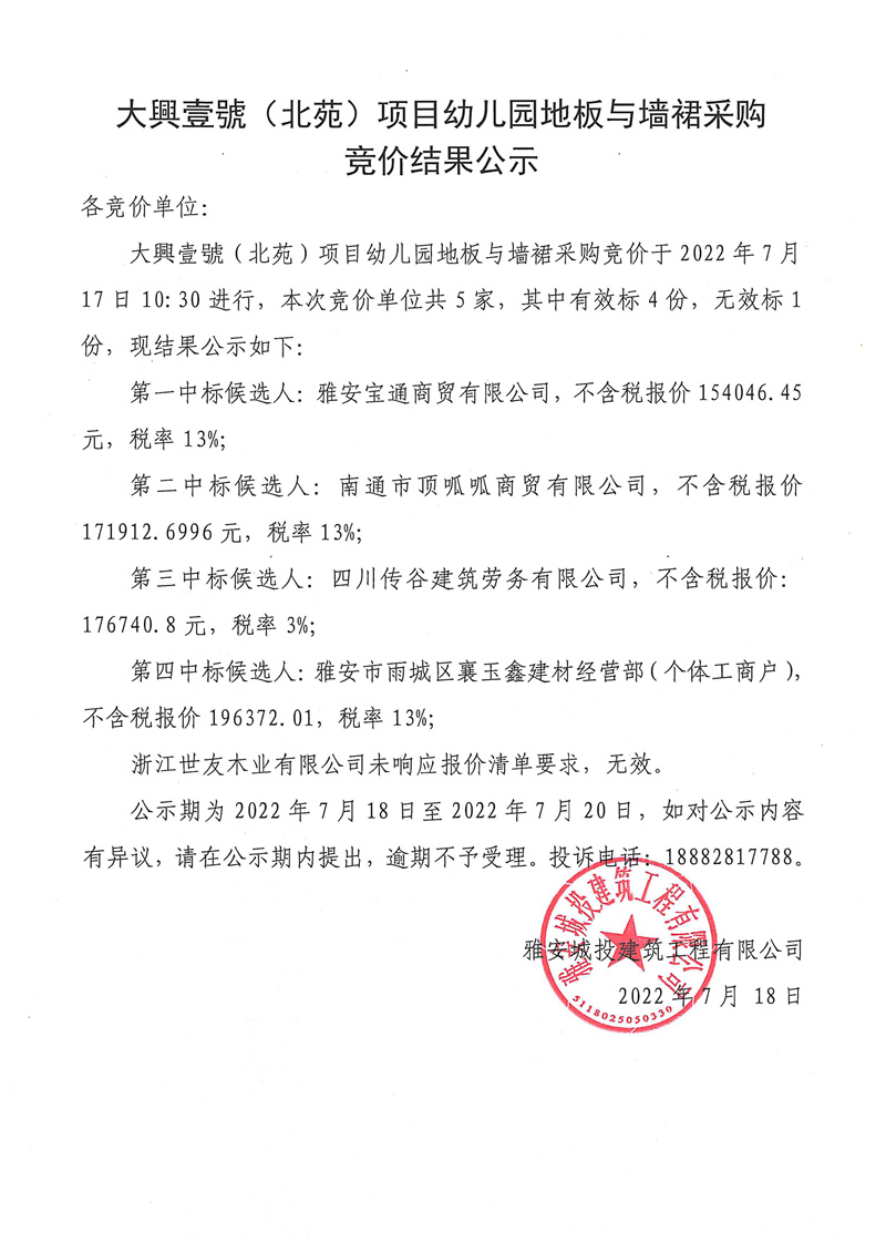 大興壹號(hào)(北苑)項(xiàng)目幼兒園地板與墻裙競(jìng)價(jià)結(jié)果公示