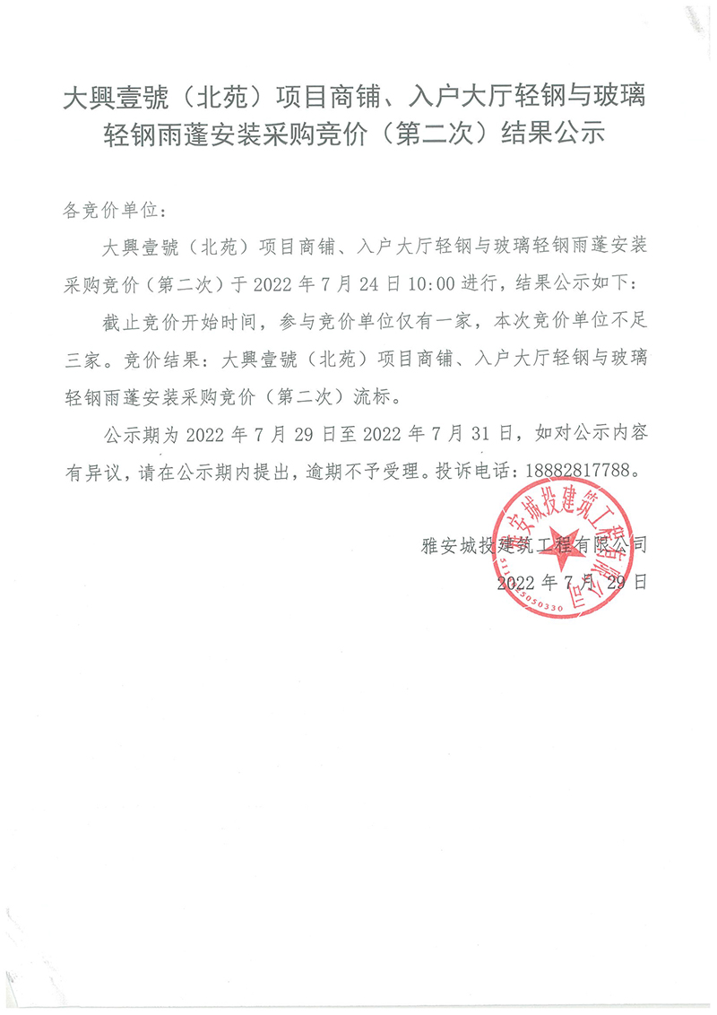 大興壹號(北苑)項目商鋪、入戶大廳輕鋼與玻璃輕鋼雨棚安裝采購競價(第二次)結果公示