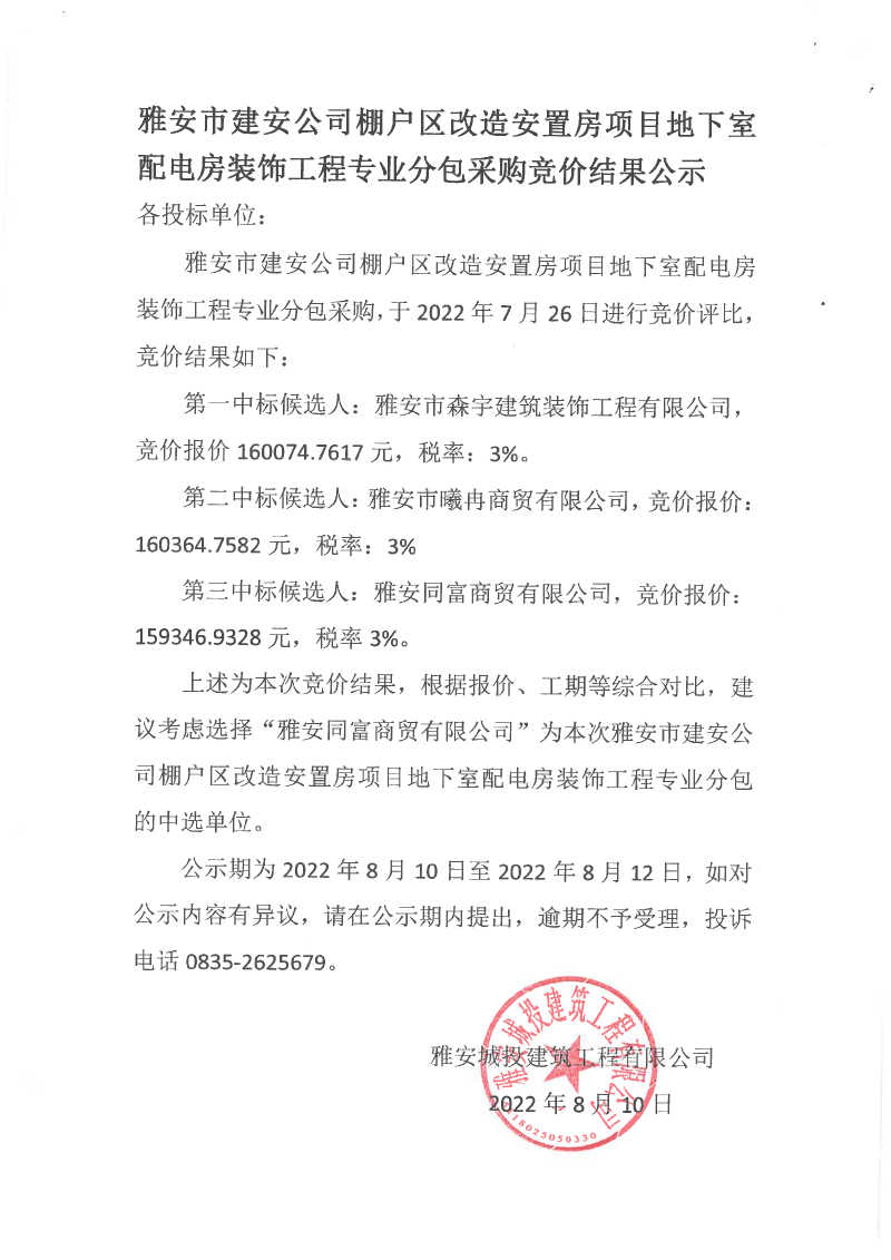 雅安市建安公司棚戶區(qū)改造安置房項目地下室配電房裝飾工程專業(yè)分包競價結果公示