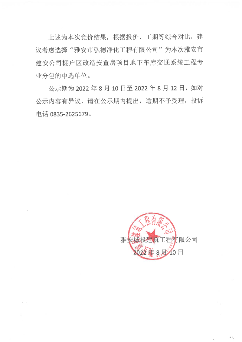 雅安市建安公司棚戶區(qū)改造安置房項(xiàng)目地下車庫(kù)交通系統(tǒng)工程專業(yè)分包競(jìng)價(jià)結(jié)果公示