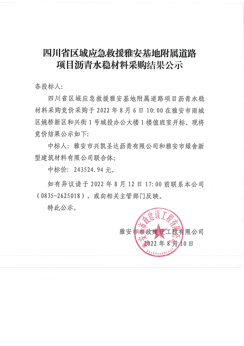 四川省區(qū)域應(yīng)急救援雅安基地附屬道路項(xiàng)目瀝青水穩(wěn)材料采購結(jié)果公示