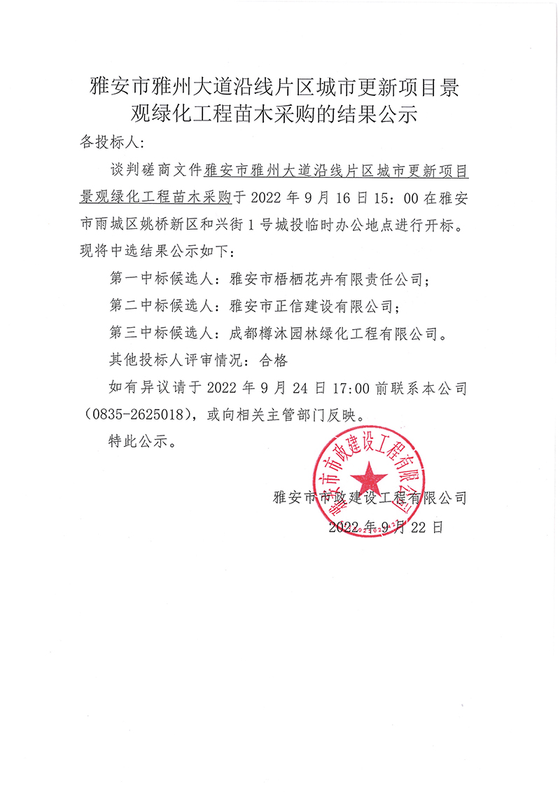雅安市雅州大道沿線片區(qū)城市更新項目景觀綠化工程苗木采購的結(jié)果公示