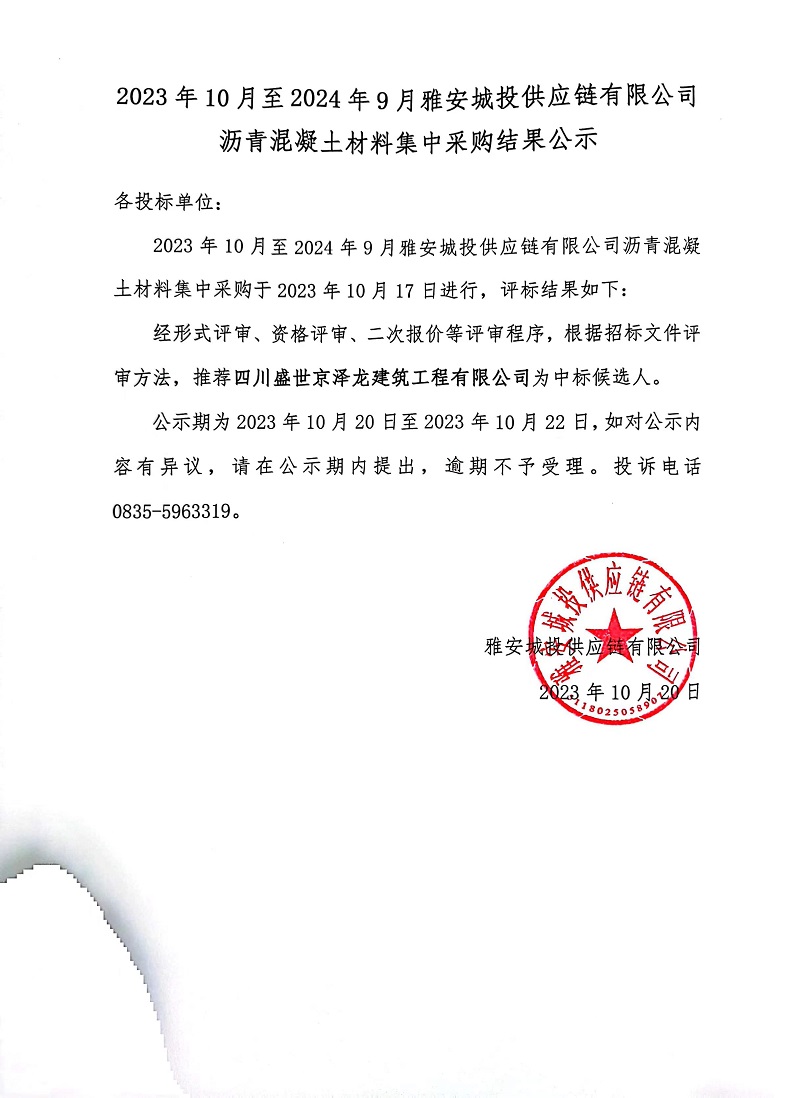 2023年10月至2024年9月雅安城投供應(yīng)鏈有限公司瀝青混凝土材料集中采購(gòu)結(jié)果公示
