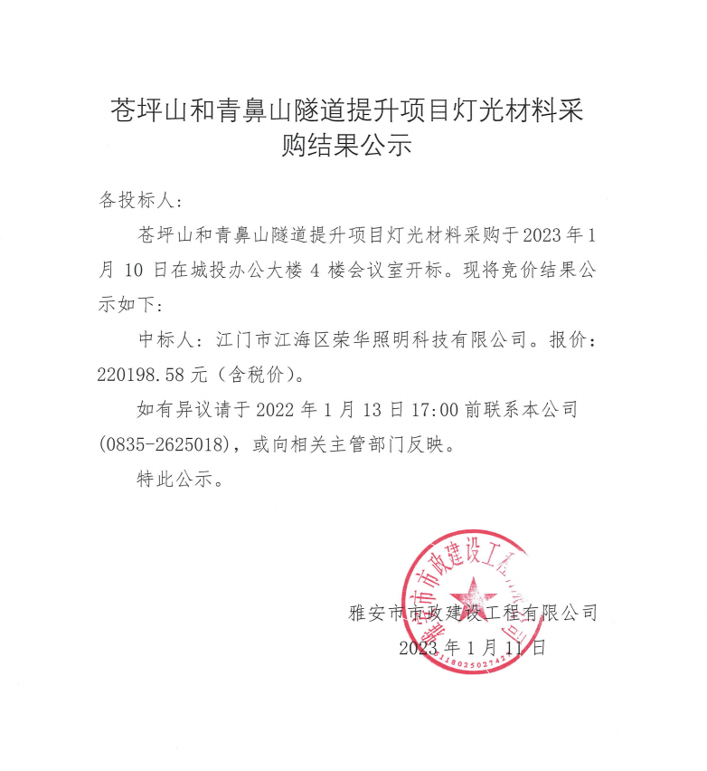 蒼坪山和青鼻山隧道提升項目燈光材料采購結果公示