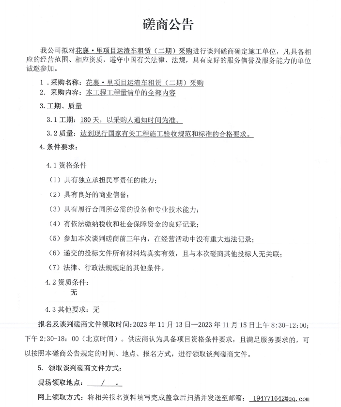 花襄·里項(xiàng)目運(yùn)渣車租賃(二期)采購談判磋商公告