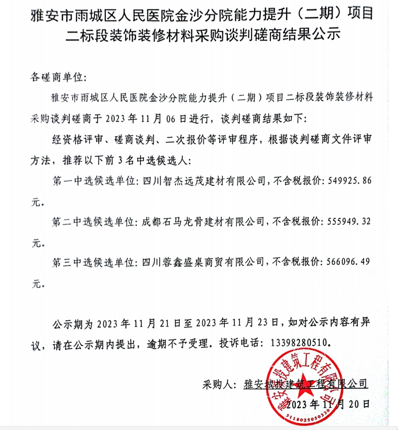 雅安市雨城區(qū)人民醫(yī)院金沙分院能力提升(二期)項目二標段裝飾裝修材料采購談判磋商結果公示