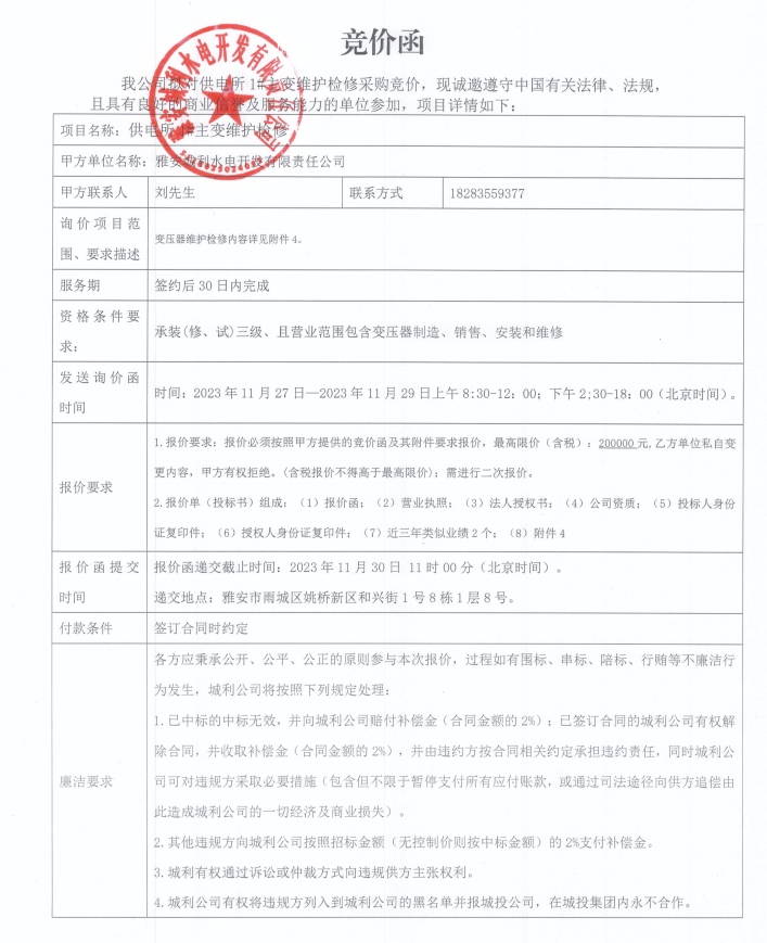 供電所1#主變維護(hù)檢修競價(jià)公告