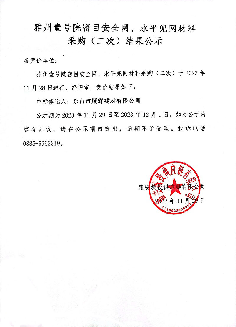 雅州壹號(hào)院密目安全網(wǎng)、水平兜網(wǎng)材料采購(二次)結(jié)果公示