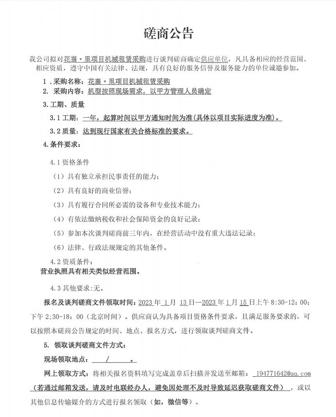 花襄·里項(xiàng)目機(jī)械租賃采購談判磋商公告