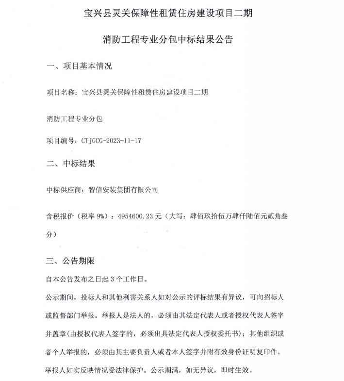 寶興縣靈關(guān)保障性租賃住房建設(shè)項目二期消防工程專業(yè)分包中標(biāo)結(jié)果公告