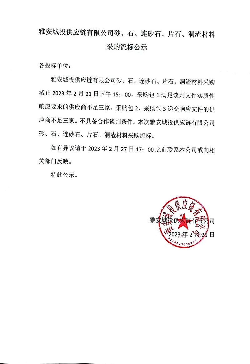 雅安城投供應鏈有限公司砂、石、連砂石、片石、洞渣材料采購流標公示