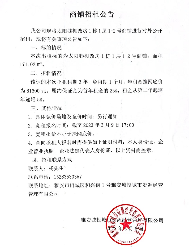 太陽巷棚改房1棟1層1-2號商鋪招租公告